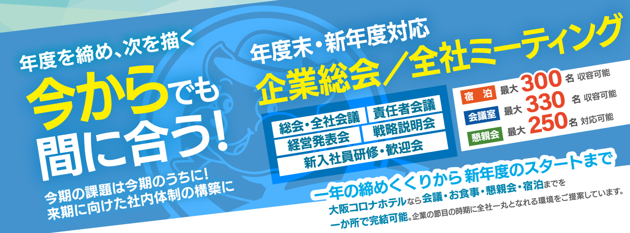 年度末の締めくくりや、新年度に向けたキックオフのご準備はお進みでしょうか。忙しさの中で後回しになりがちな 「今期の振り返り」や「来期に向けた認識合わせ」。 だからこそ、今期の課題は今期のうちに整理し、来期へ向けて全社一丸となる場を設けることが、次の一歩を力強くするきっかけになります。 大阪コロナホテルでは、会議・懇親会・宿泊までを一か所で完結できる環境をご用意しています。
