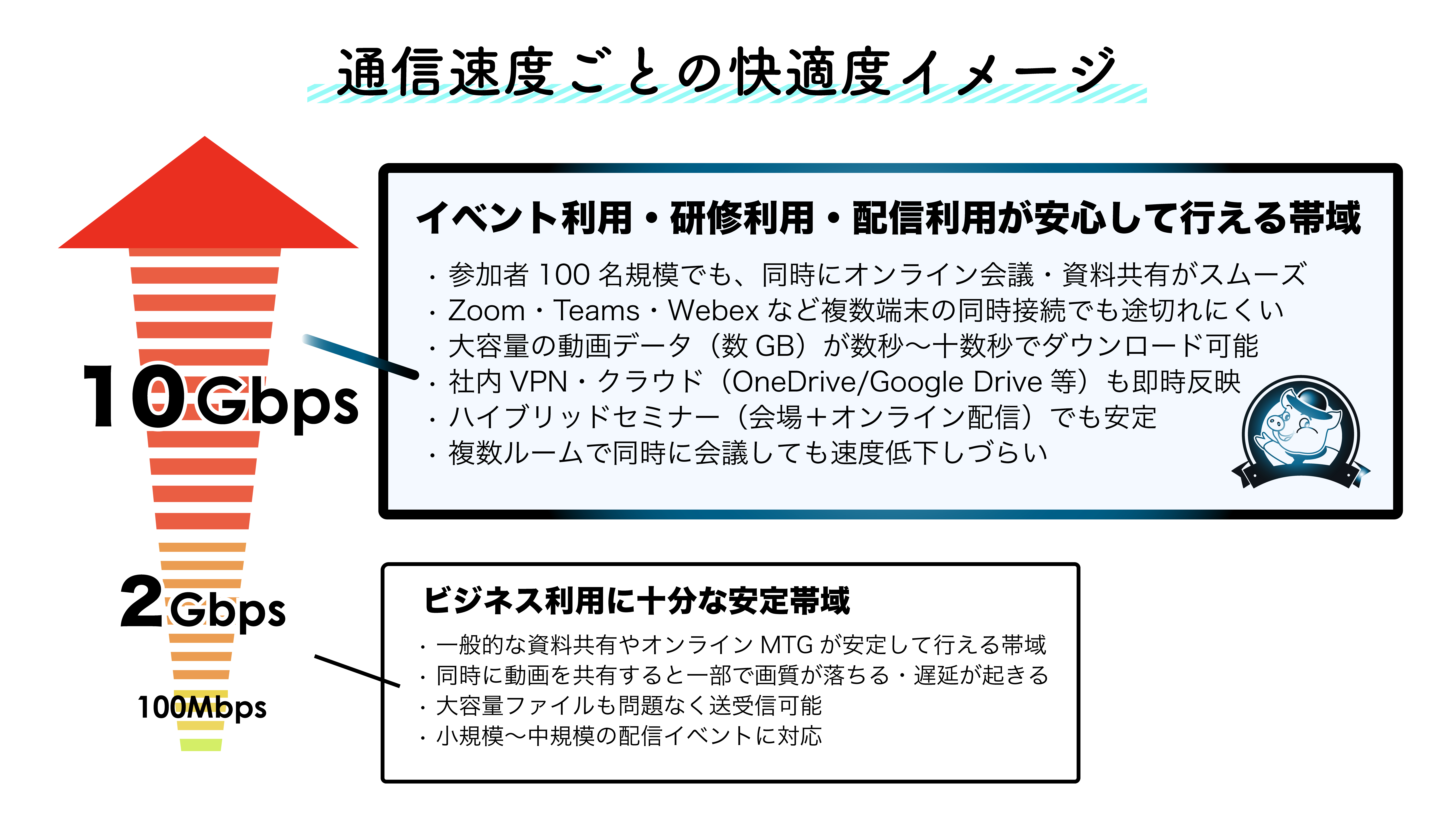 従来の2Gbpsから大幅に性能が向上し、会議やセミナーをより快適にご利用いただけます。