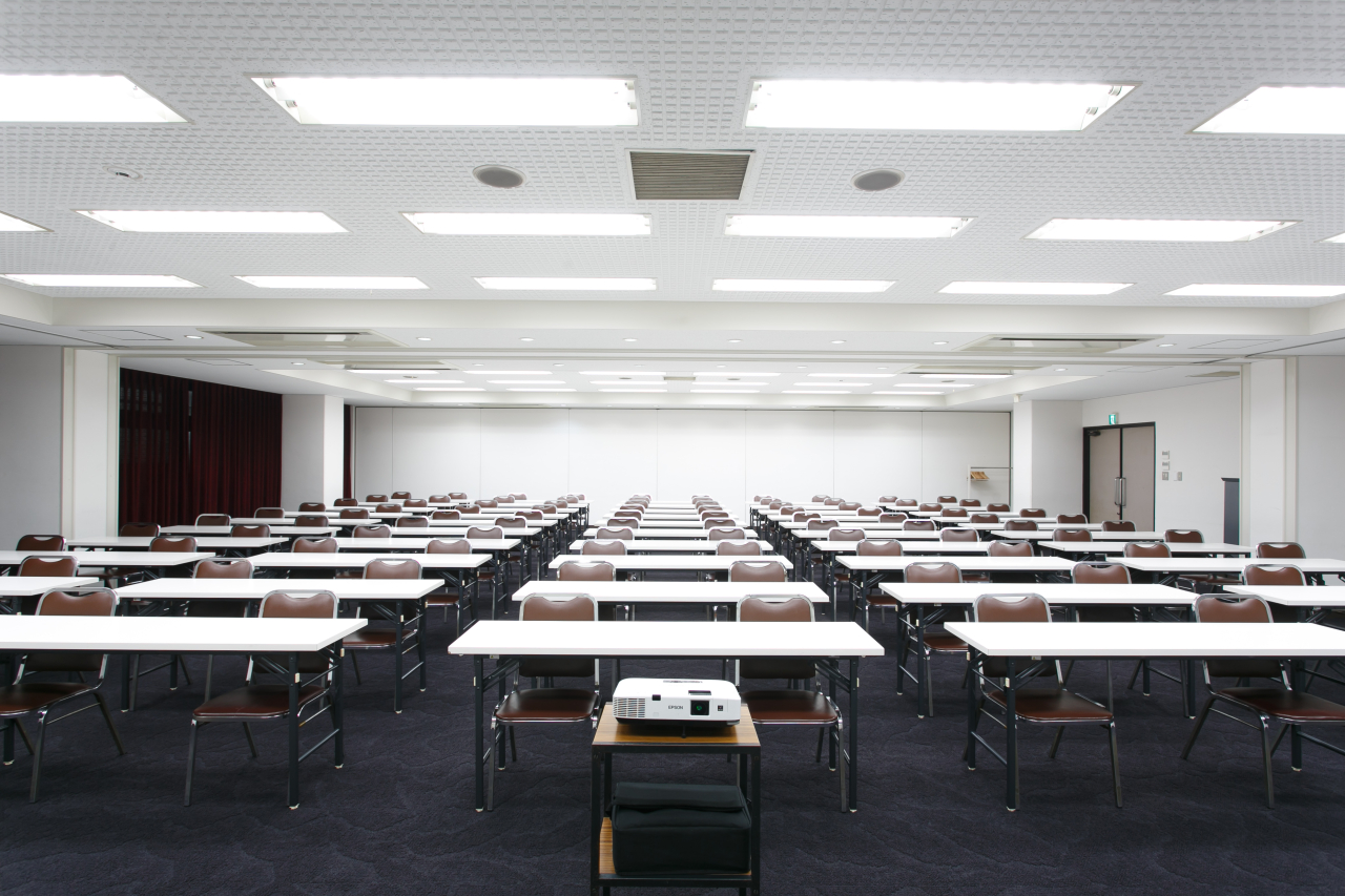 最大330名まで収容可能でセミナー・試験会場、日帰り研修、宿泊付き研修、懇親会パーティまですべて当館で完結